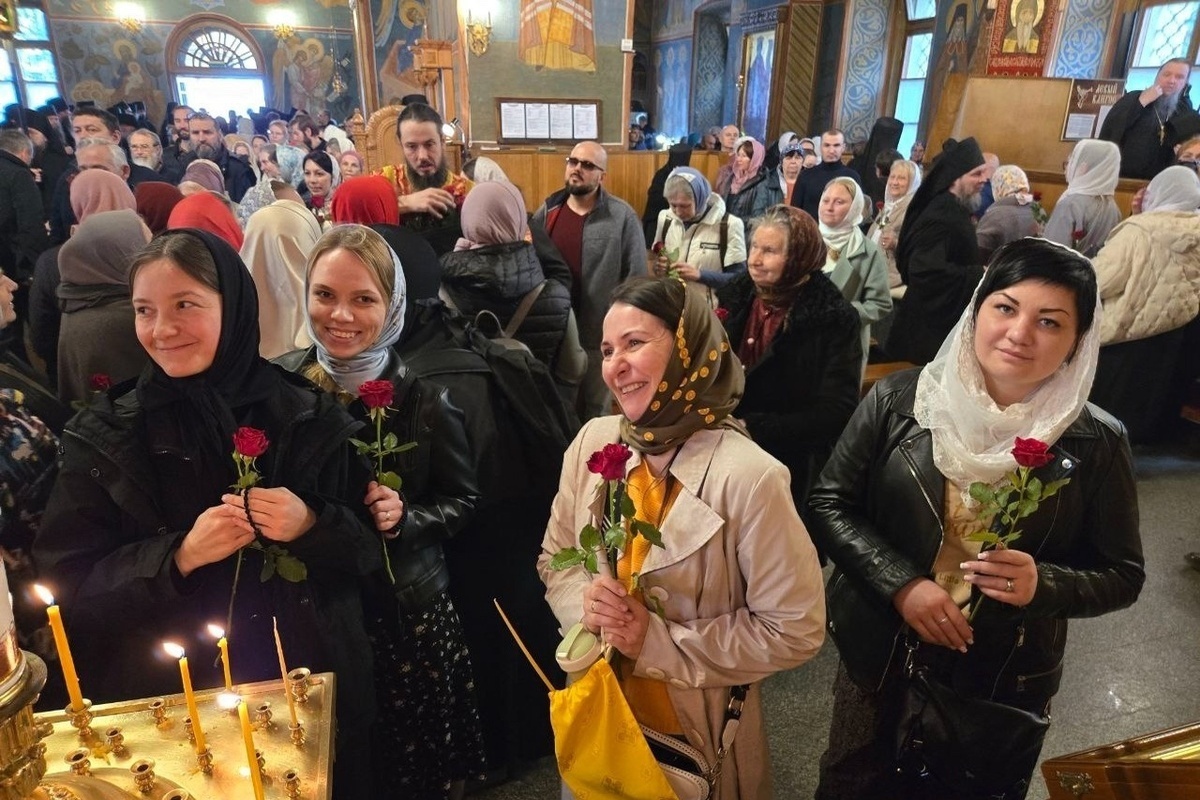 По окончанию литургии в монастыре прихожанкам дарили цветы в честь прекрасного православного праздника.