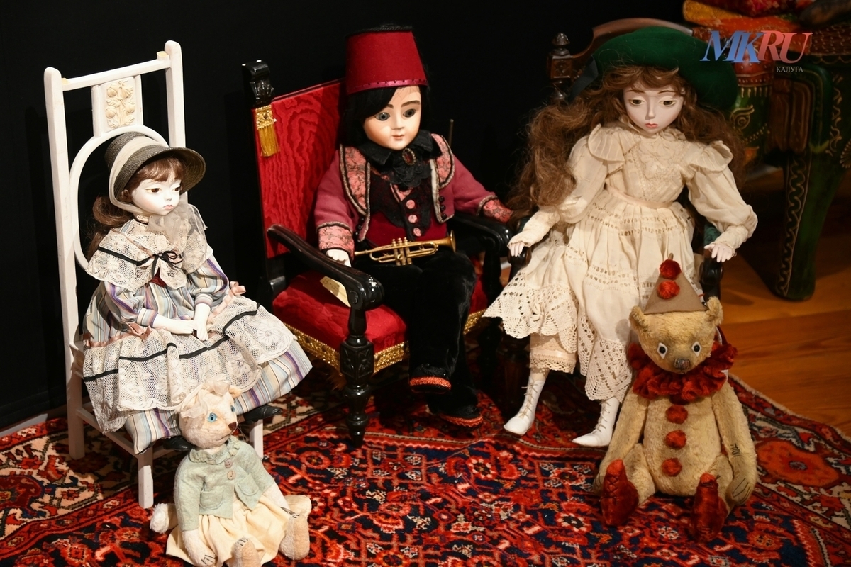 Вместе с куклами в выставочный зал калужского ИКЦ приехали собранные ей картины, расписная мебель и предметы интерьера.