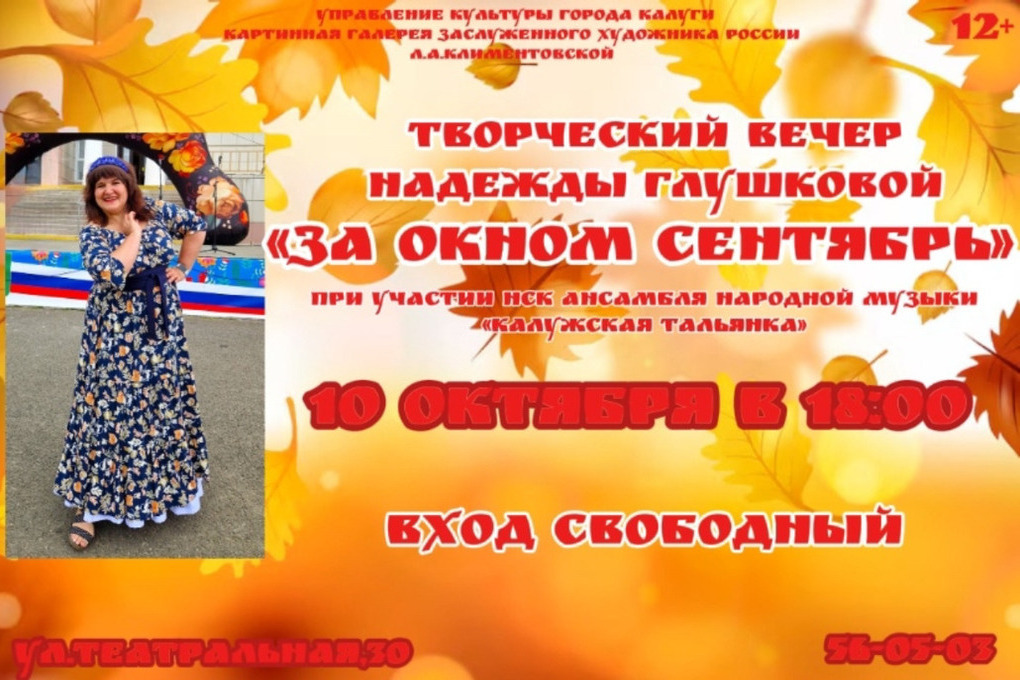 Творческий вечер «За окном сентябрь» в галерее Л.А.Клементовской проведёт поэтесса Надежда Глушкова.