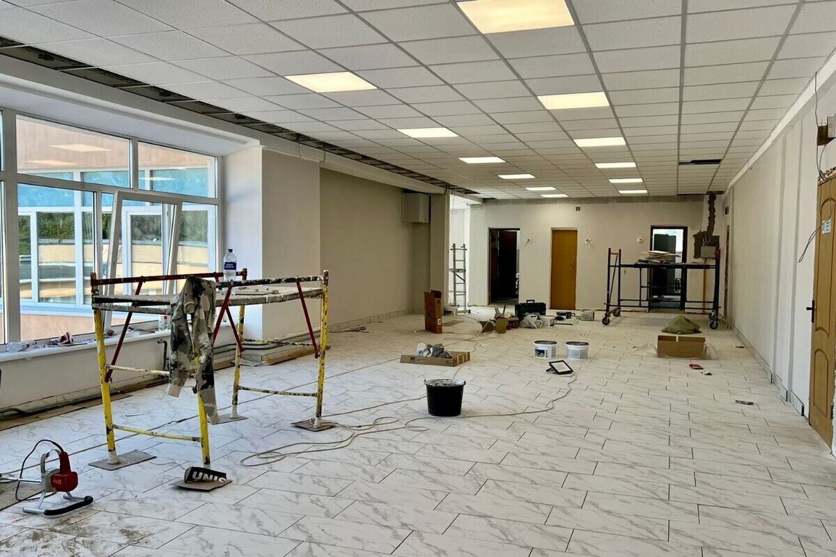 В учебном заведении продолжается капитальный ремонт, работы ведутся с напольными покрытиями, а в одном из корпусов полностью меняют инженерные сети.