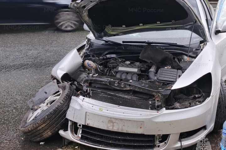 Водитель не справился с управлением и Skoda Octavia врезалась в препятствие.