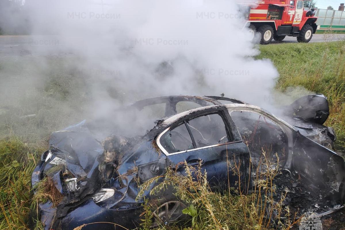 После опрокидывания иномарка загорелась. Прибывшие на место ДТП пожарные потушили огонь, но на тот момент иномарка выгорела почти полностью.