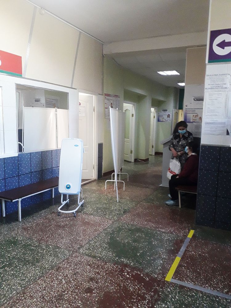 В обычной поликлинике все достаточно спокойно. Небольшое скопление возле регистратуры, а вот в коридорах возле кабинетов очередей нет. В больнице стоят ионизаторы воздуха. Все медики в медицинских масках, специальных халатах и перчатках. В поликлинике очень чисто. Уборщица обрабатывает все поверхности специальным раствором.