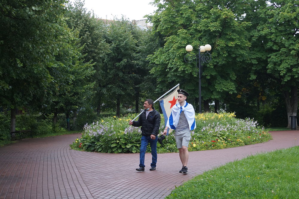 В воскресенье, 26 июля в России отмечается День Военно-Морского флота. В Калуге по традиции, служившие в ВМФ, прошли колонной по центральной улице. Дойдя до площади Победы, участники шествия возложили цветы к Могиле Неизвестного солдата и памятнику воинам-афганцам. За порядком следил наряд полиции. После официальной части, "морское братство" разделилось на группы. Кто-то с компанией пошел гулять по улицам города, а кто-то вместе с родными направился домой отмечать праздник. На Кирова встречается много автомобилей с Андреевскими флагами. Матросы приветствуют друг друга сигналами.