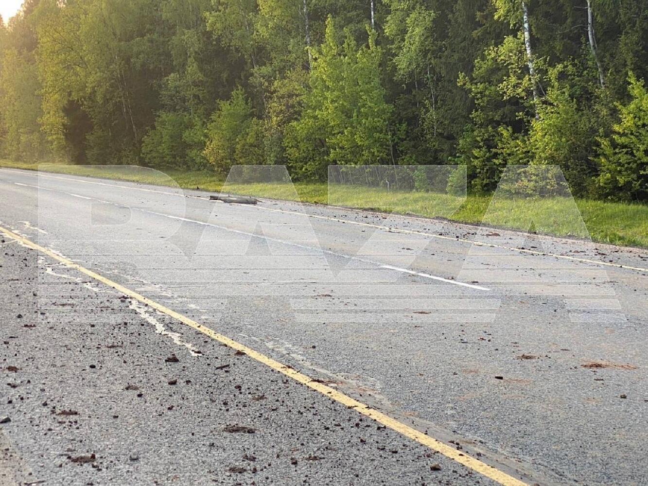 Появились первые фото с места падения беспилотника вблизи деревни Тарутино Жуковского района Калужской области. Обломки, а также части грунта при падении дрона, разлетелись по трассе. Как сообщает телеграм-канал Baza, первым о падении беспилотника сообщил в полицию водитель проезжающего большегруза. Около 19:00 мск 16 мая он ехал в сторону Серпухова и увидел падение похожего на птицу предмета. Последовал громкий взрыв и на дорогу вылетела волна грязи, обломков и веток. Фотографии с места падения публикуют телеграм-каналы Baza и SHOT.