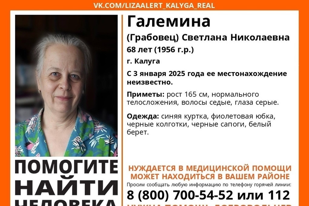 В Калуге разыскивают Светлану Николаевну Галемину (Грабовец), 68 лет, местонахождение которой неизвестно с 3 января 2025 года.
