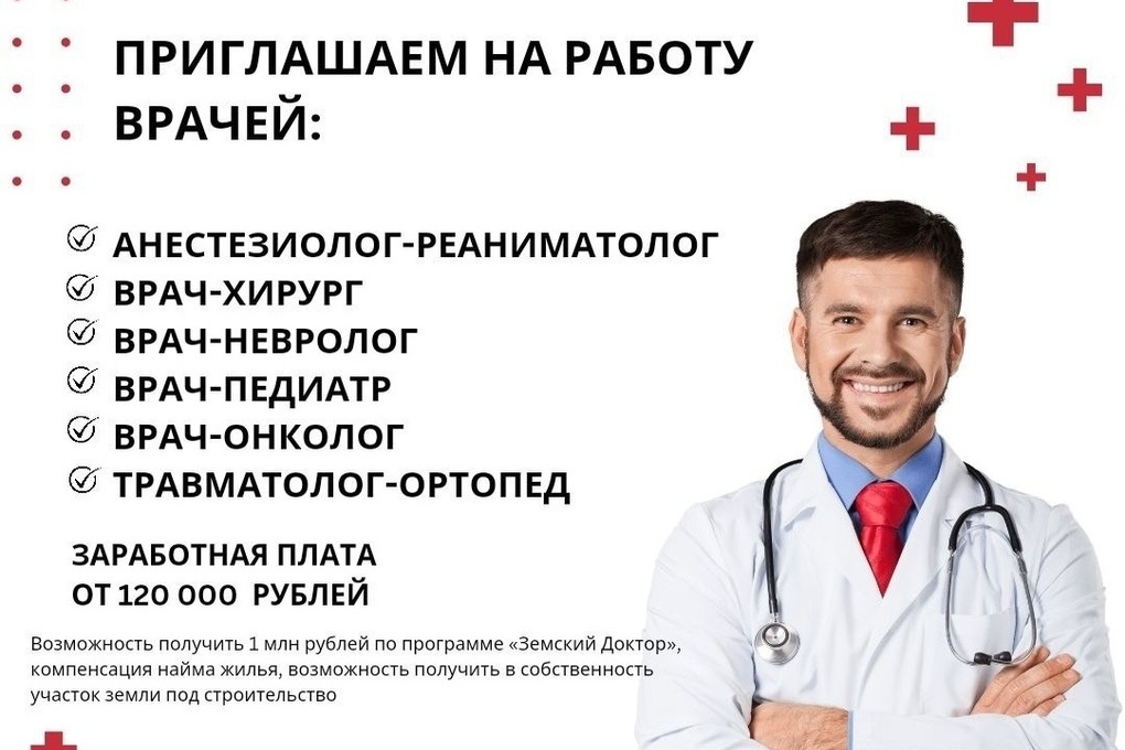 У специалистов есть возможность получения 1 миллиона рублей по программе «Земский доктор», а также и возможность получения участка земли под строительство. При необходимости найма жилья врачу компенсируют его стоимость.