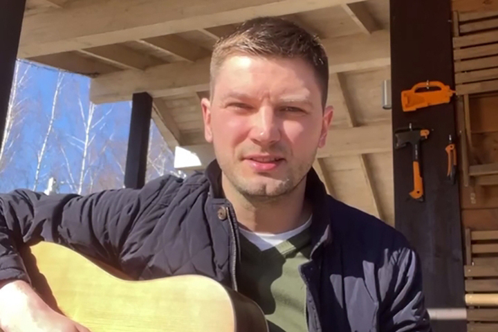 Сидя на крыльце дома он с гитарой в руках он обратился к женщинам, поздравив их праздником весны, пожелав счастья, уюта и тепла.