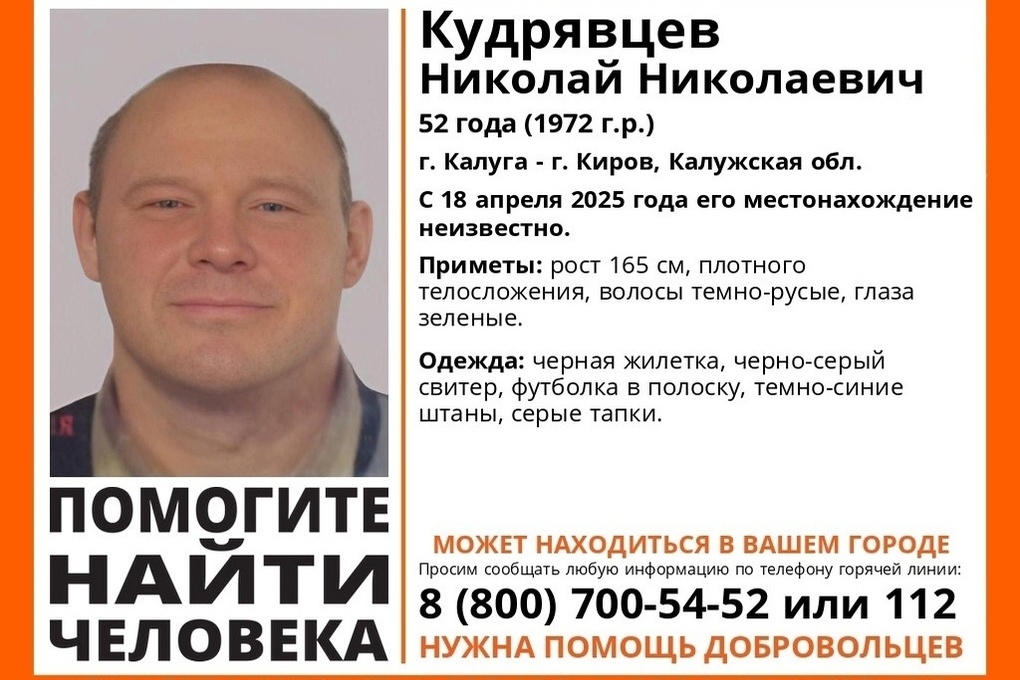 Местонахождение 52-летнего Николая Николаевича Кудрявцева неизвестно с 18 апреля.