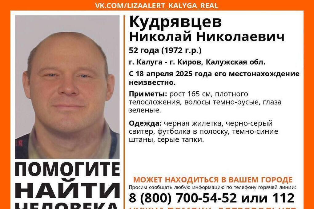 По информации поискового отряда «ЛизаАлерт», 52-летний Николай Кудрявцев, о местонахождении которого не было известно с 18 апреля, найден живым.