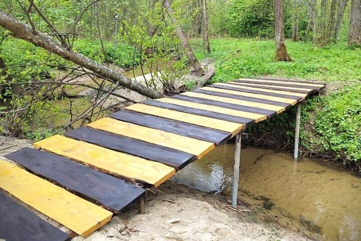 Его возвели через речку Машок в «Калужских засеках». По дну укрепили металлические конструкции, между ними протянули бревна и уложили дощатый настил.