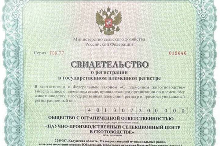 «Научно-производственный селекционный центр в скотоводстве», работающий уже более полугода под Малоярославцем, получил свидетельство о регистрации в государственном племенном регистре.