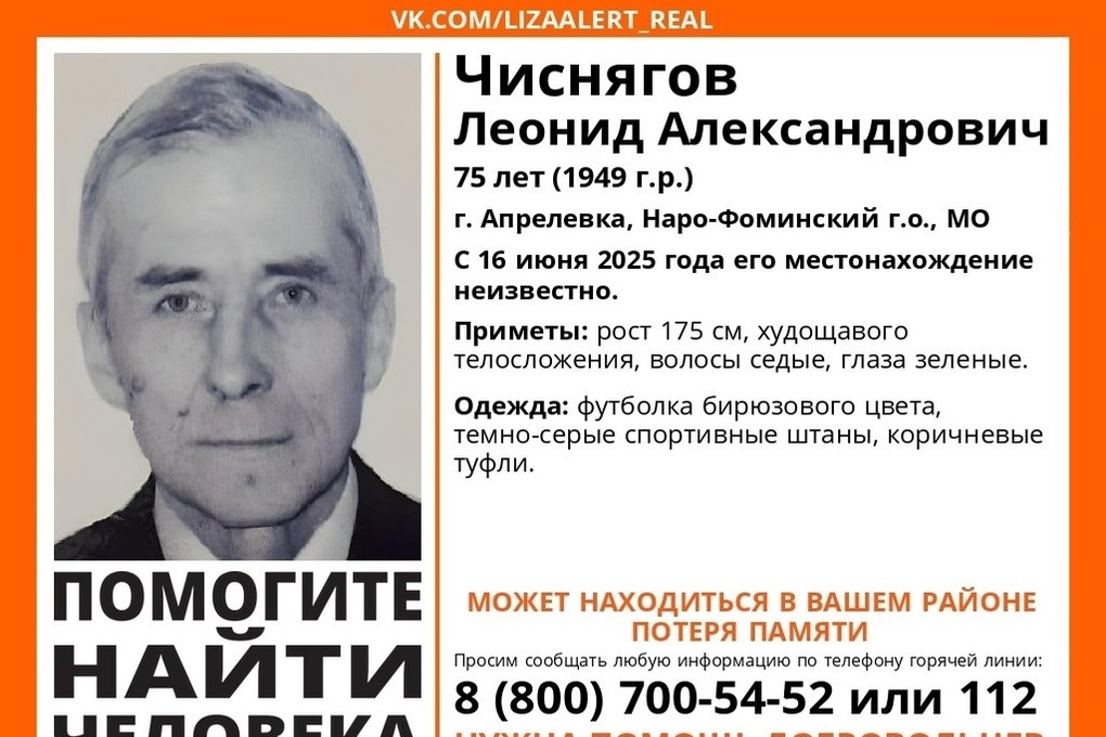 Леонид Чиснягов пропал в Наро-Фоминском районе Московской области 16 июня и до сегодняшнего дня о нем ничего неизвестно.