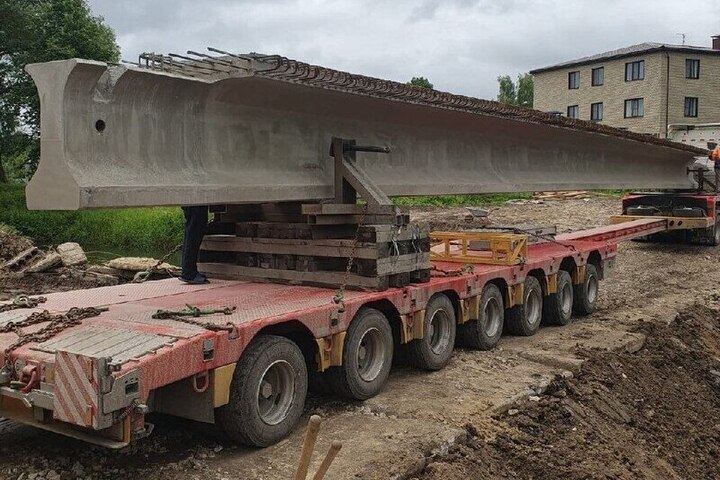 На объекте уже выполнен монтаж семи балок пролетного строения моста и ведутся работы по армированию откосных подпорных стенок сооружения.