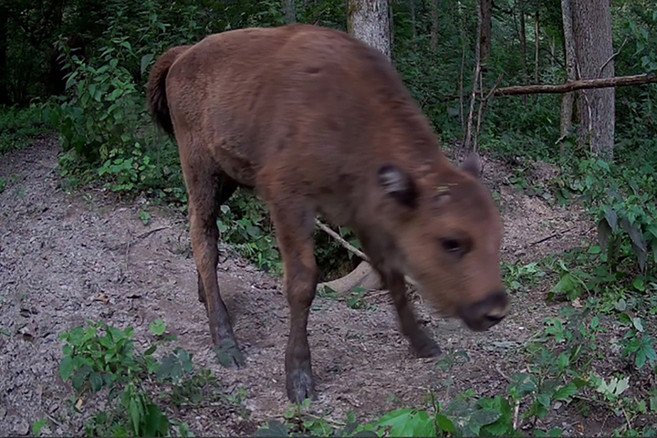 Необычную находку зафиксировали камеры заповедника «Калужские засеки» . В объектив попал тёмный зубрёнок, значительно отличающийся по окраске от большинства своих светлых сородичей.