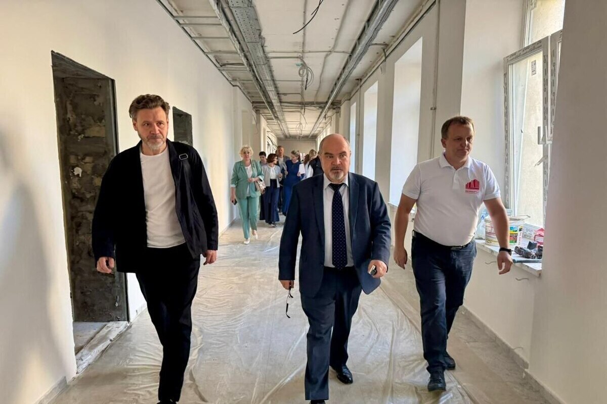 Перед центральным входом уложат брусчатку. Лежнин подчеркнул, что подрядчик должен увеличить количество рабочих, а сроки остаются под его личным контролем.