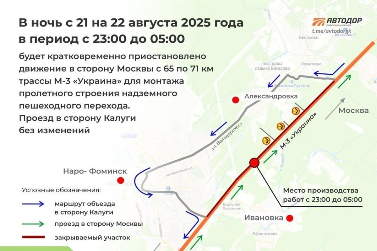 «Автодор» предупредил жителей и гостей региона о перекрытии Киевской трассы в ночь 21 на 22 августа.