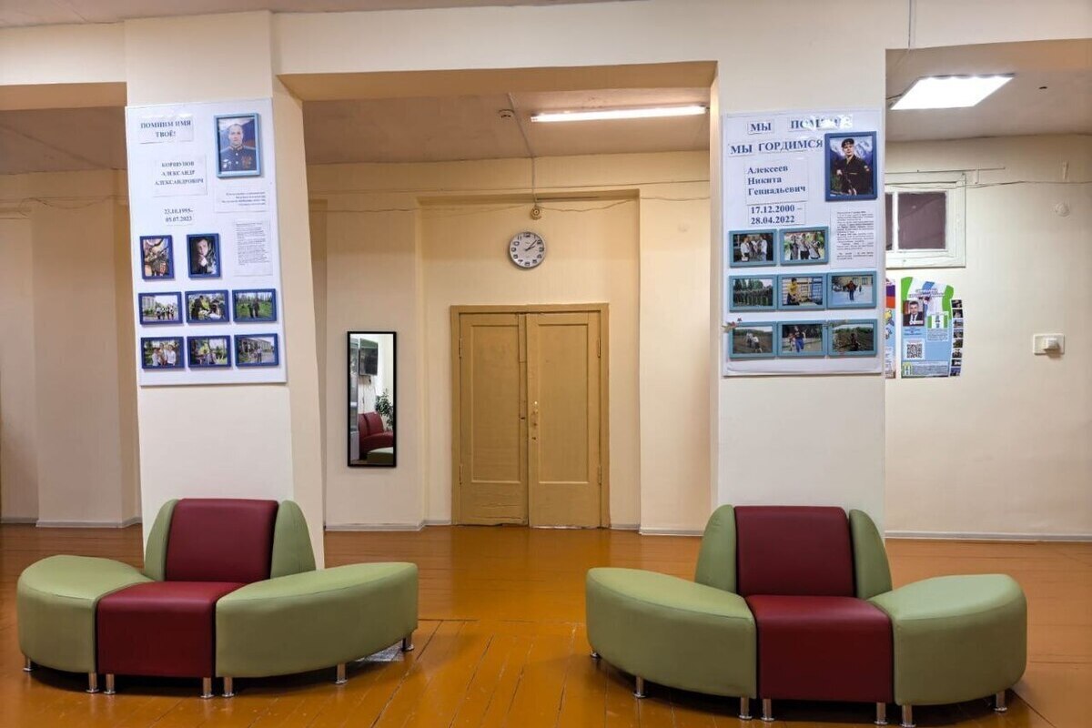 В витрине теперь выставлены школьные награды, а центральное место занимают государственные символы. Каждый понедельник здесь проходит торжественная церемония выноса флага и исполнения гимна России.