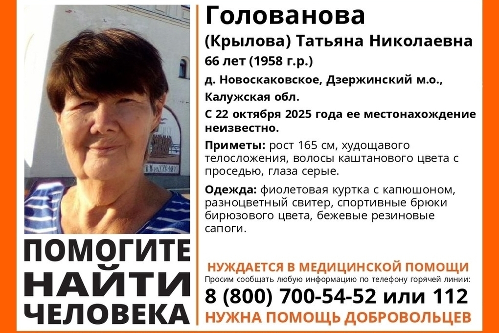 Жительница деревни Татьяна Голованова (Крылова) пропала 22 октября. Ее особые приметы сообщает «ЛизаАлерт».