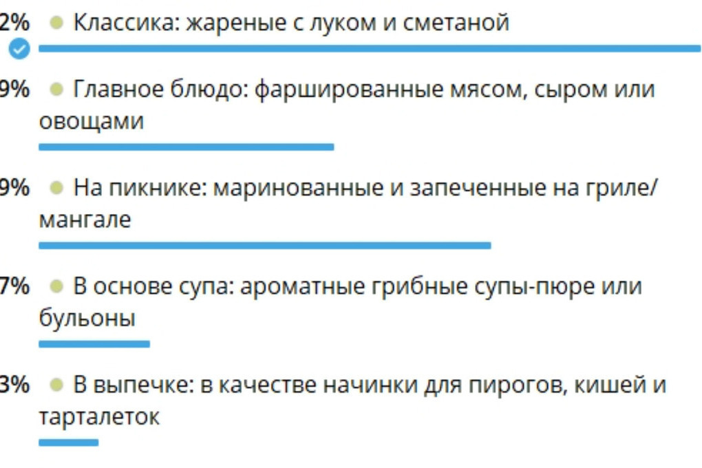 У респондентов четыре варианта ответа: выпечка, суп, фаршированные или классика - жаренные с луком и сметаной.