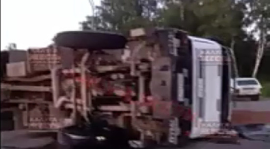 В результате ДТП одна фура перевернулась, у другой перевернулся полуприцеп. Большегрузы зацепили рейсовый автобус, в котором не было пассажиров. Пострадал только 1 водитель фуры. Он от госпитализации отказался.